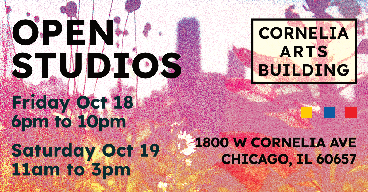 The Cornelia Arts Building – Where Art Works 1800 West Cornelia, Chicago, IL 60657 Entrance on NW corner of Ravenswood and Cornelia. Located two blocks south of Addison Brown Line CTA Station. Free parking available in lot and in neighborhood. https://www.corneliaartsbuilding.com/events/open-studios-october-2024/