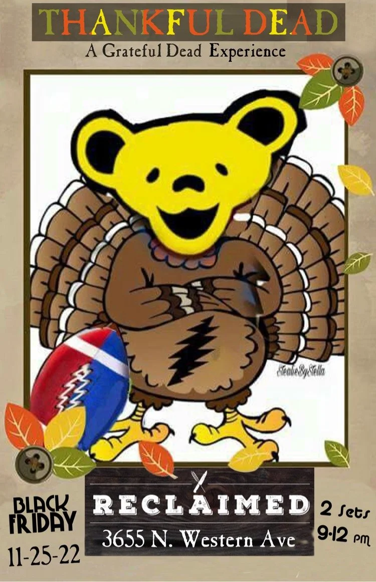 Thankful Dead - A Grateful Dead Experience Friday, November 25, 2022 9:00 PM 11:55 PM Reclaimed Bar and Restaurant 3655 North Western Avenue Chicago, IL, 60618 United States (map) Google Calendar ICS Join Reclaimed Bar and Restaurant for some live music taking place on Black Friday. They will be celebrating their six year anniversary with a Grateful Dead Cover Band that will kick off on Black Friday 11/25.